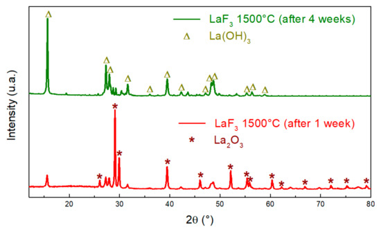 On the other hand, the peaks present in the XRD pattern of the sample after thermal treatment of LaF3 in a furnace at 1500 °C correspond mainly to the known peaks of La2O3 (red pattern in Figure 4) [24]. However, some peaks do not correspond to the La2O3 structure. To puzzle out this problem and better understand the origin of these peaks, our sample was studied by XRD a week after its thermal treatment, and the same XRD pattern appears. We then performed the XRD of the same sample after 4 weeks. The obtained pattern shows a structure very close to that of La(OH)3 [25] (green pattern in Figure 4). The production of lanthanum hydroxide is due to a reaction, at room temperature, between La2O3 and water from the atmosphere [26,27].