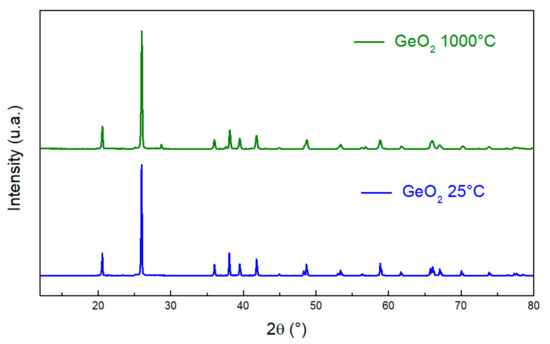 Germanium dioxide evaporates completely at 1500 °C. Therefore, we applied a thermal treatment at 1000 °C; it retains its structure without any reaction with air humidity, as shown in the XRD pattern in Figure 5.