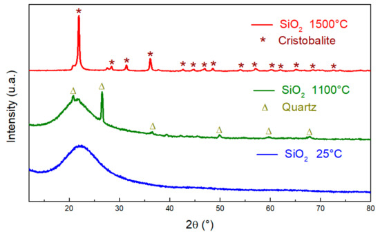 On the other hand, the amorphous structure of silica begins to crystallize into quartz [28] at 1100 °C; and at 1500 °C, it gives the cristobalite crystalline phase (Figure 6) [29].
