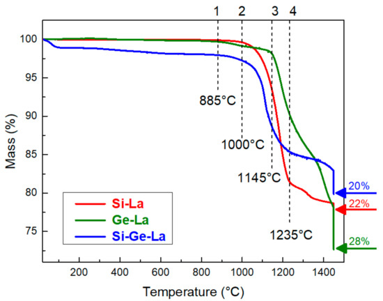 Looking at the Si-Ge-La curve, we can notice a mass loss of about 1% at the start of the study before 100 °C. This is due to the dehydration of the mixture, which could adsorb water from the atmosphere during preparation. Then, the sharp decrease in mass begins at 1000 °C. It is slower at the same inflection point of Si-La and Ge-La (1235 °C) but at an intermediate value of mass loss (15%). We can notice that the shapes of the curves of Si-La and Si-Ge-La are similar but with a lower loss for Si-Ge-La.