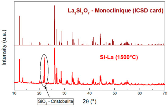 XRD patterns of Si-La after thermal treatment with the ICSD card of monoclinic La2Si2O7 [30,31]. Adapted with permission from Ref. [30]. Copyright 2022, Zeitschrift fur Kristallographie. Adapted with permission from Ref. [31]. Copyright 2022, Royal Society of Chemistry.