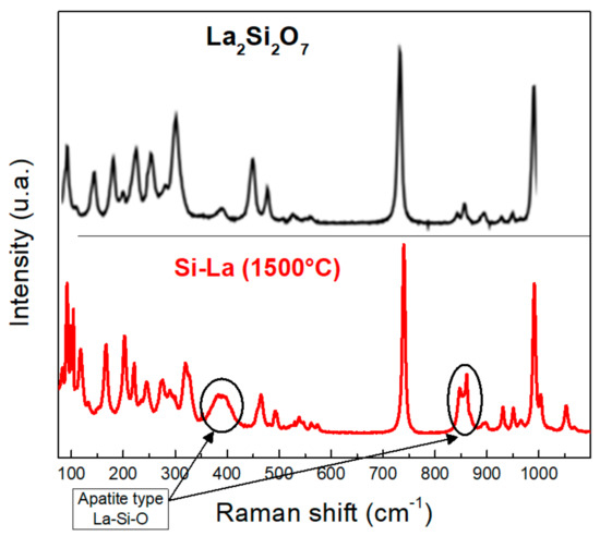 The Raman spectrum in Figure 10 shows that the spectrum of Si-La corresponds strongly to that of La2Si2O7 [32]: especially the two peaks between 450 and 500 cm−1 and the two intense peaks around 750 and 1000 cm−1, respectively. This comes in good agreement with the results obtained previously.