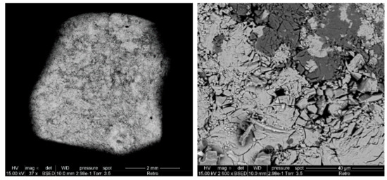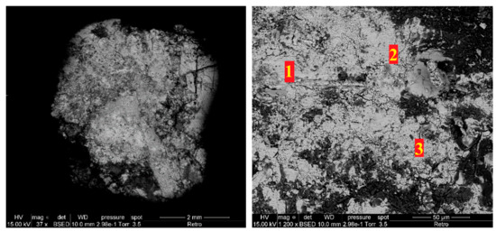Before studying the mixtures, it is necessary to understand the behavior of each reagent and to study the evolution of the chemical structure under thermal treatment of all the starting compounds. Therefore, we carried out the same thermal studies for each reagent taken separately. A thermal treatment at 1500 °C was applied in addition to the same TGA protocol. SEM images of a mixture of three compounds before thermal treatment show three different areas (Figure 1); each mainly corresponds to one of the compounds.
