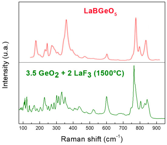 We have not found a Raman spectrum of La2Ge2O7 in the literature to compare it with that of Ge-La after thermal treatment. However, Figure 13 gives us an idea of the expected shape; we compared our spectrum with that of LaBGeO5 [36]. The comparison of these two Raman spectra tends to show that the obtained product could be some type of lanthanum germanium oxide, especially the peaks around 600, 780, 800 and 850 cm−1. According to XRD, the pattern indicates that it would be La2Ge2O7. In addition, the measured composition by EDX in the light gray zone agrees with this composition whose theoretical percentages of the elements in La2Ge2O7 are 63.6% of oxygen and 18.2% of germanium and lanthanum each. The dark gray zone could be associated with the majority presence of GeO2.