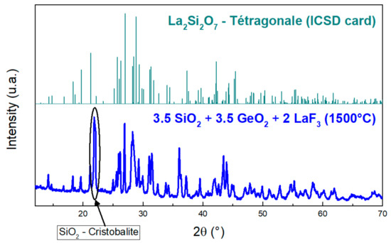 The XRD gives a pattern of Si-Ge-La after thermal treatment close to that of La2Si2O7 (Figure 15), but the obtained crystal structure from the latter is tetragonal [37], which is different from that obtained for Si-La after thermal treatment, which was monoclinic. However, as in Si-La after thermal treatment, the intense peak at 2θ = 22° comes from the presence of cristobalite in the medium. In addition, there are no corresponding peaks to a crystallized compound that contains germanium.