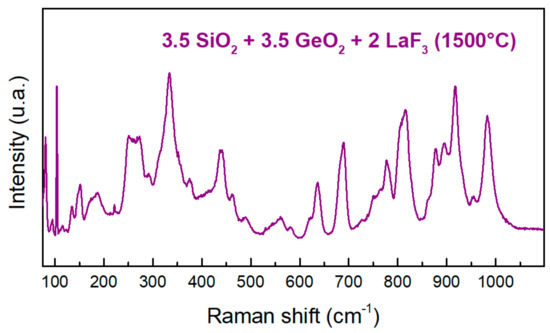 According to the TGA curves already presented, the mass loss for Si-La begins 150 °C before that of Ge-La. In addition, mass losses for Si-La and Si-Ge-La start at the same temperature (1000 °C). This may mean that in the ternary mixture, the reaction begins between silica and lanthanum trifluoride to form La2Si2O7. This reaction consumes all of LaF3 before reaching the reaction temperature between the latter with GeO2, which in its turn mostly evaporates in the absence of another reagent. The atomic percentages obtained by EDX of the elements La, Si and O can be attributed to the presence of La2Si2O7. The EDX also shows that a small amount of GeO2 succeeds to react in the medium to give some type of La-Ge-O compound in small amounts, which is in agreement with the obtained Raman spectrum of Si-Ge-La after thermal treatment.