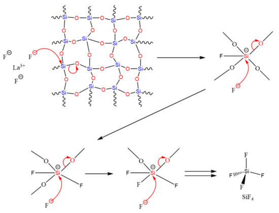 The obtained results go in the direction of the presence of a reaction between fluoride ions and silicon oxide with the release of SiF4. This release was observed in the two binary mixtures but also in the ternary. Fluoride is considered to be a very nucleophilic ion with a high electron density, allowing it to attack the metal center, which is considered to be electrophilic and able to extent its coordination number [39]. The high stability of the M–F bond generates a breaking of the M-O bond, whose bond energies are lower (case of Si). The repetition of these attacks on M leads to the formation of MF4. As an example, the SiF4 formation mechanism is presented in Figure 17. The release of this gas leads to the formation of La2Si2O7 and La2Ge2O7 after the thermal treatment of Si-La and Ge-La, respectively.