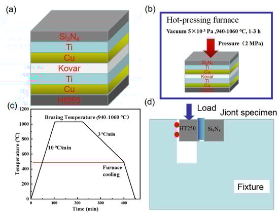 Before joining, the Si3N4 ceramics, interlayer materials, and Ht250 were assembled sequentially, as shown in Figure 2a. The assembled samples were then put into a ZM (Y) series vacuum hot pressing furnace (Figure 2b) (Shanghai Chenghua Electric Furnace Co., Ltd., Shanghai, China). The samples were heated to 940–1060 °C in a vacuum at 5 × 10−3 Pa for 1–3 h. The process temperature curve is shown in Figure 2c. The micromorphology of the interface was observed and analyzed by a FEIQuanta250F (Nanjing, China) scanning electron microscope (SEM) equipped with an energy-dispersive spectrometer (EDS) to analyze the element distribution. The hardness of the interlayer was measured by a Vickers hardness tester. The phase analysis at the interface of the joint was carried out by using the Raman spectrometer of model DXR2. The mechanical properties of the joint were tested by an electronic universal mechanical testing machine (Figure 2d) at a moving speed of 0.2 mm/min, and the shear strength of each parameter was the average of 3–4 samples.
