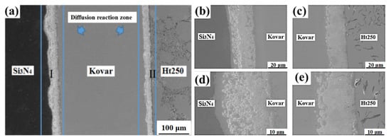 The morphology of the Si3N4/Ti/Cu/Kovar/Ti/Cu/Ht250 integral joint maintained at 1000 °C for 1 h: (a,b,d) microscopic magnification diagrams of diffusion reaction zone I; (c,e) microscopic magnification diagram of diffusion reaction zone II.