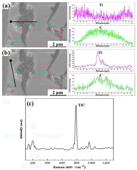 As shown in Figure 5b, the cps curve of C element showed a peak at the tangent point, while the cps value of the Ti element also showed a peak value, which is highly consistent with the trend of the C element, and proves that there was obvious aggregation of the Ti element here, combined with the results of two line scans. It can be inferred that Ti reacted with graphite in Ht250 cast iron to form a TiC phase. Similarly, graphite on the surface of PTLP diffusion bonding of Ht250 cast iron more easily made contact with the Ti element, and the reaction between them was stronger, which greatly increased the wettability of Ti–Cu liquid to the surface of Ht250 cast iron. The Raman spectrum scanning test was carried out at the interface of the joint, and the existence of TiC phase was detected near 800 cm−1 (Figure 5c), which proved that the active element Ti could reacte with graphite in Ht250 to form a TiC phase, which was consistent with the previous analysis.
