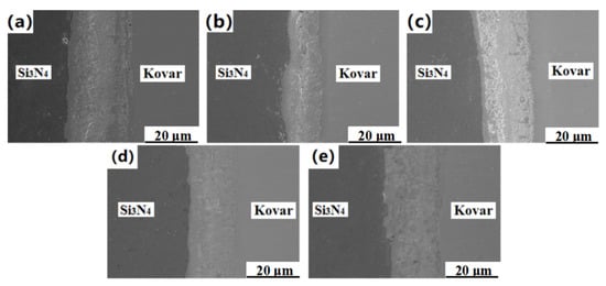The microstructure of Si3N4/Ti/Cu/Kovar joints at (a) 940 °C, (b) 970 °C, (c) 1000 °C, (d) 1030 °C and (e) 1060 °C.