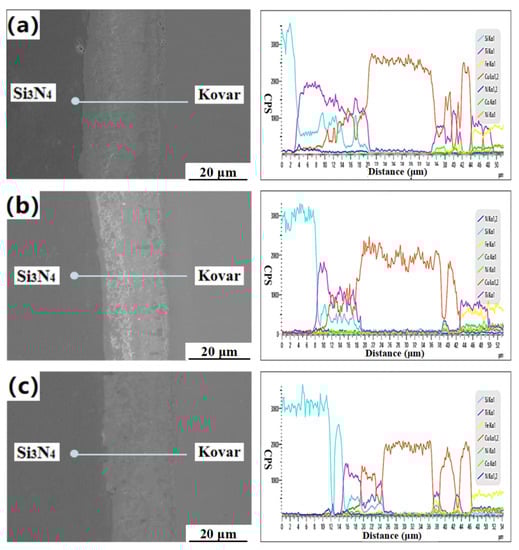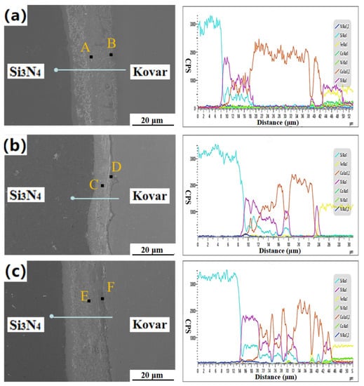 In the 1–3 h holding time interval, tightly connected joints were obtained, but the thickness and distribution of the interface reaction layer were significantly different. As seen in Figure 10a, there was a 3–4-μm-thick reaction layer at the interface of Si3N4 ceramics, and dispersed reactants on the right side of the reaction layer. Dispersed reactants formed at the interface of the Kovar alloy. Notably, the width of the Si3N4 ceramic interface reaction layer and the nearby dispersed reactants both became thicker, the transition was more natural, and the reaction layer at the Kovar alloy interface became more obvious (Figure 10b). When the holding time reached 3 h, it can be seen from Figure 10c that the dispersed reactants on the Si3N4 ceramic side continued to extend to the Kovar side, almost connecting with the Kovar alloy interface reaction layer. Therefore, we suggest that the joints of Si3N4 ceramics/Ti/Cu/Kovar under different holding times are all tightly welded, but with the increase in holding time, the distribution of dispersed reactants in each reaction layer and the vicinity of the reaction layer changes. For further verification, EDS line scan and point scan analysis were performed on the connection interface under different incubation times.