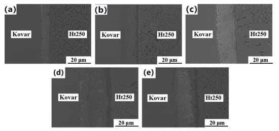 The microstructure of Kovar/Cu/Ti/Ht250 joints at (a) 940 °C, (b) 970 °C, (c) 1000 °C, (d) 1030 °C and (e) 1060 °C.