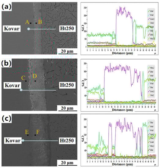 As shown in Figure 8, at a temperature range of 940–1060 °C, tight joints were obtained, but the thickness and morphology of the diffusion reaction layer were significantly different. It can be seen from Figure 8a that, at 940 °C, there was an obvious interface reaction layer at the Ht250 side interface, of about 3–4 μm, but only a few point-like reactants near the Kovar alloy interface; there were very few point-like reactants near the interface of the Kovar alloy, and obvious delamination at the joint, accompanied by cracks and hole defects. Defects such as joint delamination and voids were significantly improved when joined at higher temperatures. The dispersed reactants began to appear near the Ht250 interface reaction layer and gradually increased, extending to the Kovar alloy side; the reactants near the Kovar alloy interface also increased, and the transition to the two sides became more natural. Therefore, we deduce that the diffusion interface of Kovar/Cu/Ti/Ht250 at is more tightly welded a higher temperature and the diffusion between atoms is more sufficient. In order to verify this hypothesis, the bonding interface at different welding temperatures was analyzed by EDS line scanning and point scanning, as shown in Figure 9.