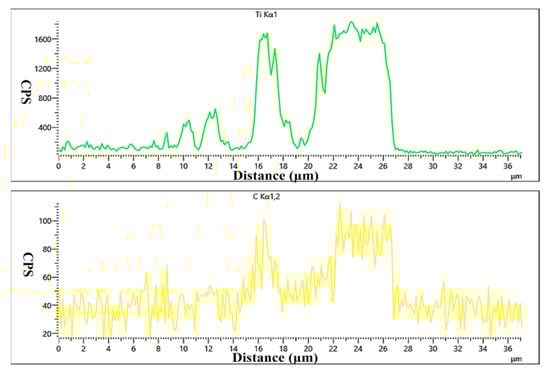 As shown in Figure 4, the C element in Ht250 cast iron existed not only in the form of Fe3C, but also in the form of flake graphite, which covered the whole surface of Ht250—one of the main reasons for its poor weldability. The purpose of this experimental design was to use Ti/Cu/Kovar/Cu/Ti as the intermediate layer in the hope that the active element Ti would react with the graphite on the surface of Ht250 to form a TiC phase to increase its wettability and cooperate with part of the transient liquid phase formed by Cu–Ti to form a compact and high-performing joint. Therefore, EDS line scanning of graphite near the Ht250/Ti/Cu interface was carried out, and it was found that, when the line scanning path runs through the graphite, the cps curve (the diffusion curve of the element, which is defined as the cps curve below) of the C element shows a peak shape, while the cps curve of the Ti element shows a less obvious peak at the edge of the graphite, indicating that the Ti element may have gathered at the edge of the graphite. In order to further confirm the distribution of Ti around graphite, the line scanning path was converted to be tangential to graphite and scanned again.
