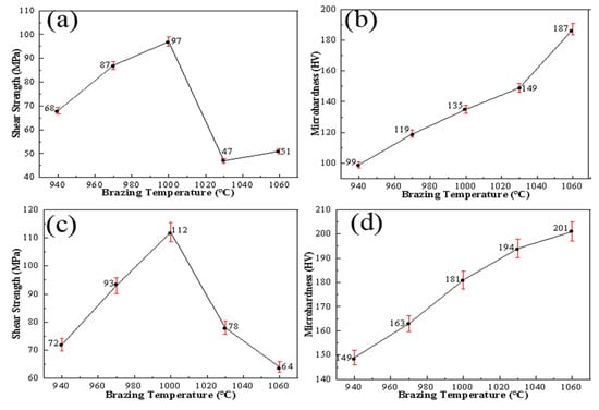 Mechanical properties and microhardness of joints under different welding temperatures: (a,b) Ti/Cu/Ti shear strength and interlayer microhardness; (c,d) Ti/Cu/Kovar/Cu/Ti shear strength and interlayer microhardness.