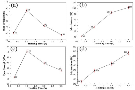 Mechanical properties and microhardness of joints under different holding times: (a,b) Ti/Cu/Ti shear strength and interlayer microhardness; (c,d) Ti/Cu/Kovar/Cu/Ti shear strength and interlayer microhardness.