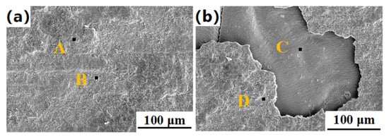 Figure 15 shows the microstructure of the shear fracture of the Si3N4/Ti/Cu/Kovar/Cu/Ti/Ht250 joint under the two processes. The fractures were all on the Si3N4 ceramic side, but the specific fracture position was different, indicating that the bonding strength of the Ht250 side was higher. Table 7 and Table 8 give the EDS scanning results of each area in Figure 15. Table 7 shows that, under processing parameters of 2 MPa and 1000 °C for 15 min, the fracture mainly contained a small amount of TiN phase (region A) and Ti5Si3 phase (region B). Similar to the intermediate layer, this was at the reaction layer of Ti–N and Ti–Si. The reason for the fracture was that the holding time was too short, which made the reaction layer here too thin and the bonding force weak. It can be seen from Table 8 that, under processing parameters of 2 MPa and 1000 °C for 1 h, the fracture at the joint mainly contained Cu4Ti3, TiFe, TiFe2, and TiNi3 (region C) and a small amount of Cu4Ti3 (region D), corresponding to Figure 15b. The silvery white area contained a large amount of Ti–Ni compounds, and the brittle phase was the main reason for the fracture of the joint there.