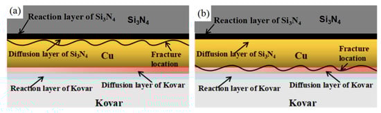 As shown in Figure 16b, the position and mechanism of the fracture of the Si3N4/Ti/Cu/Kovar joint changed. The fracture was located in the Kovar interface reaction layer near the Kovar alloy interface on the Si3N4 ceramic side, which was mainly composed of Ti–Fe, Ti–Ni and a small amount of Ti–Cu, which was the weak point of the whole joint. This indicated that a large number of Ti elements diffused to the interface of Kovar alloy through the liquid zone of Ti–Cu, and an interface diffusion layer composed of Cu–Ti metal compounds formed on this interface. This greatly alleviated the aggregation of Ti–Cu intermetallic compounds near the Si3N4 interface reaction layer, thus greatly reducing the stress near the ceramic interface, so the fracture site changed to near the Kovar alloy interface layer. At the same time, the thermal expansion coefficient of the Kovar alloy itself was closer to that of Si3N4 ceramics, so the overall strength of the joint increased, and the maximum was 112 MPa.