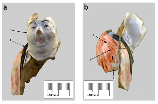 Polychrome figurine from Anan’evka walled settlement. Upper part of the figurine: (a)—front position, (b)—profile position. The arrows correspond to the points of taking the pXRF spectra.
