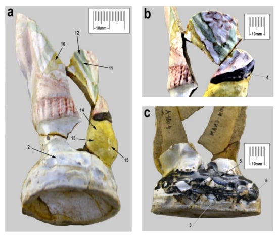 Polychrome figurine from Anan’evka walled settlement. Middle (a,b) and lower (c) parts of the figurine. Thin arrows correspond to the points of taking the pXRF spectra.