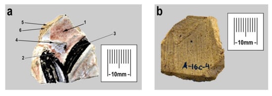 Polychrome figurine from Anan’evka walled settlement. Separate fragments. (a)—outer surface, the arrows mark sites of SEM-EDS examination. 1—red glaze decoration, point 1; 2—red glaze decoration, point 2; 3—black glaze decoration, point 1; 4—white slip, point 1; 5—ceramics paste, point 1; and 6—ceramics paste, point 2. (b)—inner surface with the imprints.