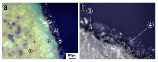 The OM image of the sample’s profile section showing layers sequence. (a): 1—the paste, 2—white slip, 3—black glaze, 4—transparent glaze. (b): 3—black glaze, 4—transparent glaze. The magnification 50×.