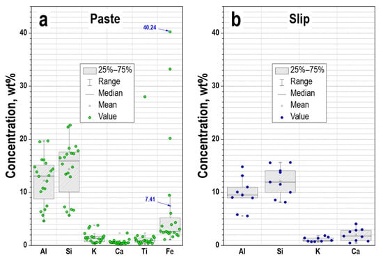 Box-and-whiskers plots for chemical compositions of paste (a) and slip (b).
