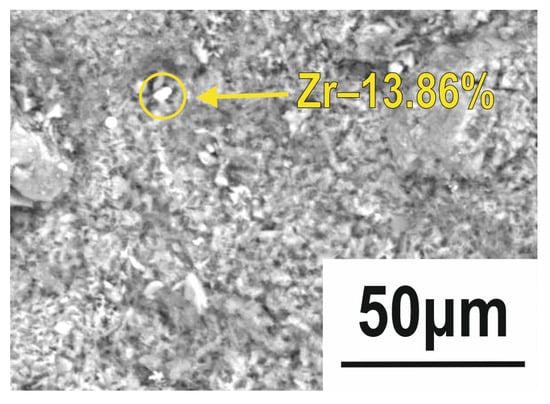 At examined point 1, a single EDS spectrum No. 9 detected a high concentration of zirconium as 13.86%. The SEM image of the point 1 shows that this spectrum corresponds exactly to a brightly white angled grain of a metallic type (Figure 8). As is known, the zirconium occurs in some clays as natural mineral inclusions or impurities []. The presented data may be interpreted as just such a case.