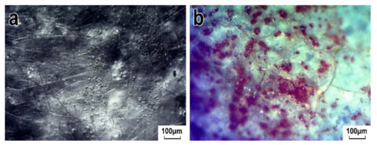 OM images of surface texture of the black area (a) and red area (b) on the separate fragment of the figurine. The magnification is 50×.