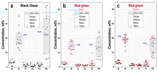 The Fe concentration in the pXRF spectra is 6.28–14.02% and 0.40–3.53% in the EDS spectra. As is known, the presence of ferric oxides in glaze composition activates the crystallization processes during post-firing cooling []. Ca and K in the EDS spectra are presented in insignificant and almost equal concentrations and dispersions (Table 1, Figure 10a). The plot diagram of black glaze element concentrations shows significant heterogeneity of the Si and especially Pb in contrast to the Al, K, Ca, and Fe (Figure 11a).