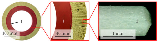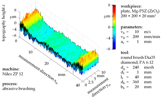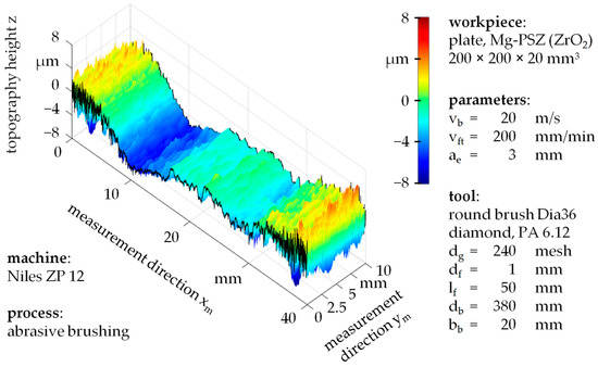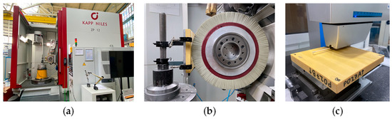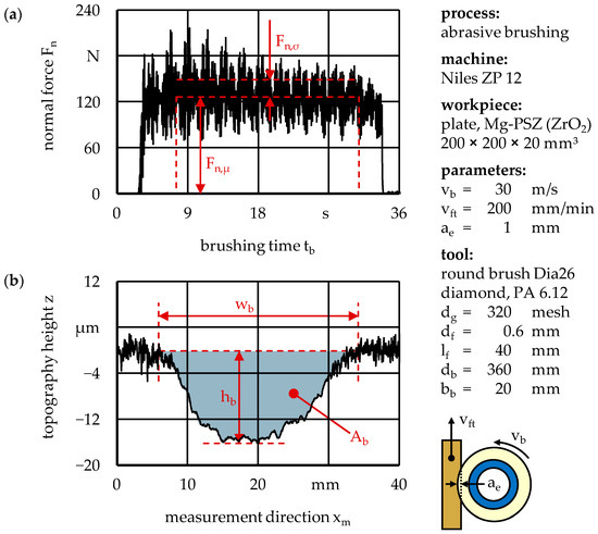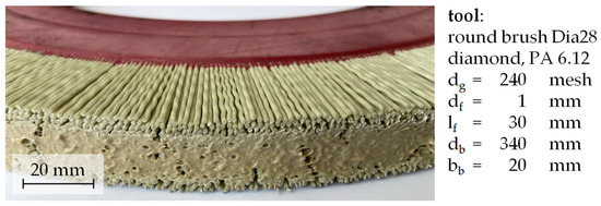 Figure 3b. Although the thermal conductivity of the workpiece material was specified as 3.0 W/(m∙K) at room temperature, which is low compared to previously investigated metals, no cooling lubricant was used during brushing. This choice was made in order to decrease the number of possible influences on the measurement of process forces and the work result, as the polyamide matrix of the abrasive filaments is prone to the absorption of liquids, which increases their elasticity and in turn decreases the process forces [