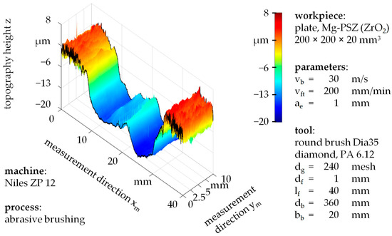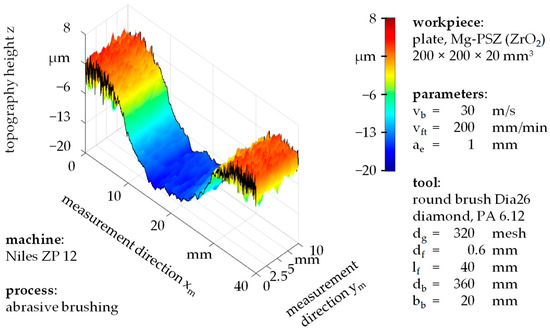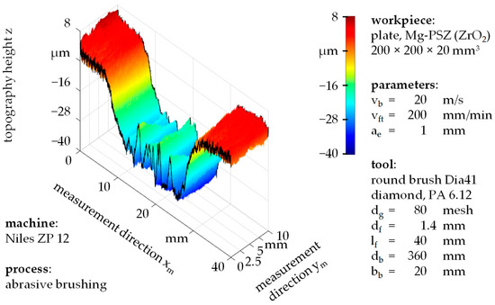 5], it was always measured starting at the profile center to achieve high repeatability. Each experiment and each roughness measurement were repeated three times, yielding nine measurements per process parameter combination. For selected parameter combinations, topography measurements across the entire width of the brushed profile were carried out in order to determine the profile width w