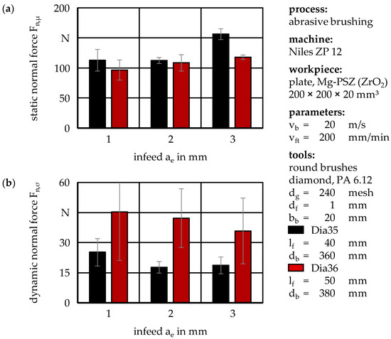 This decrease in the dynamic normal force Fn,σ with increased infeed ae is likely a result of prolonged filament–workpiece contact, resulting in both an increased contact time tc and a larger contact length lc, leading to a larger number of abrasive filament beings in contact with the workpiece simultaneously, thus stabilizing the process.