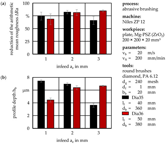 On a side note, it should be mentioned that brushing with an infeed of ae < 1 mm is theoretically possible, but potentially ineffective due to the eccentricity of the brushing tools: depending on the measurement position, the actual tool diameter db,a deviates up to ±0.5 mm from the nominal tool diameter of db = 380 mm; this is purely a result of the tool manufacturing process, specifically the filament tips being sheared off to their nominal length as a final manufacturing step. Therefore, not the entirety of abrasive filaments would be in contact with the workpiece if an infeed of ae < 1 mm were chosen. To minimize this inevitable diameter deviation, brushing tools may be dressed with an abrasive workpiece or a dressing stone prior to usage. However, as part of these technological investigations, it was found that such dressing processes were highly inefficient due to the abrasive nature of bonded polycrystalline diamond, resulting in rapidly blunted dressing stones, the pores of which are clogged with polymer residue, and the polymer matrix of the filament tips becoming frayed rather than cylindrical. Hence, the industrial fine-dressing of relatively inexpensive abrasive brushing tools would be too costly in the current state of technology.