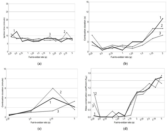 Dependence of the combustion characteristics for the SCS process on the φ parameter: (a) tign(φ); (b) tcomb(φ) from φ = 0.25 to φ = 2; (c) tcomb(φ) from φ = 2.25 to φ = 3; (d) Km(φ).