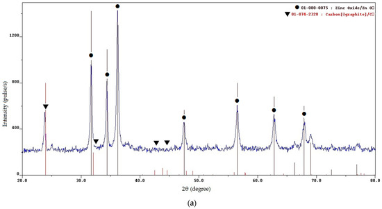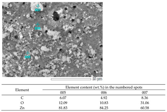 The XRD results for the minimum value φ = 0.25 (Figure 2a) show that the synthesis product consists of two phases: zinc oxide (ZnO) and free carbon (C). To make it easier to evaluate and distinguish the characteristic peaks of ZnO and C, the signs ● and ▼ are added to them, respectively. The presence of free carbon can be explained by the fact that at a minimum value of φ, the combustion temperature is minimal and not high enough for the complete oxidation of glycine even with an excess of oxygen, which leads to the appearance of free carbon in the combustion product [24,27]. High, narrow reflection peaks of ZnO indicate the formation of good crystalline ZnO powders obtained by the synthesis. The sizes of the crystallites determined by calculation according to the Scherrer formula are 22, 26, and 18 nm at the three peaks with the highest intensity, and the average size of the crystallites is 22 nm. It can be seen from Figure 3a that the resulting powder has a homogeneous structure with non-agglomerated, clearly defined particles of equiaxed crystals of submicron sizes. Thus, it can be concluded that an ultrafine powder with a particle size of less than 1 μm, consisting of a mixture of nanoscale and submicron particles, has been synthesized. The results of the EDS analysis of the local elemental composition of this powder at three spots are shown in Figure 4. These results show content from 4.92 to 8.36 wt.% of the carbon in combustion product, which corresponds to the results of the XRD analysis in Figure 2a for the presence of free carbon in the product.