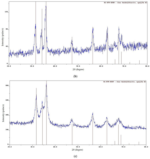The phase composition of the synthesized products was analyzed using an ARL X’TRA X-ray diffractometer (Thermo Fisher Scientific, Basel, Switzerland) equipped with an X-ray tube with a copper anode with a maximum power of 2200 W. Scanning was performed in the 2θ range of angles (20–80°) at a speed of 2 deg/min. The microstructure and elemental chemical composition were studied with a scanning electron microscope (SEM) JSM-6390A (Jeol, Tokyo, Japan) equipped with an energy-dispersive spectroscopy (EDS) module JSM-2200. Crystallite sizes were calculated from X-ray peak broadening using the Scherrer formula. The particle-size distribution of the synthesized powder was determined by laser diffraction of aqueous suspensions containing the particles using a Sald-2300 analyzer (Shimadzu, Kyoto, Japan). The band gap of the ZnO was measured by registering the edge of absorption of electromagnetic radiation using a UV-2600 UV-vis spectrophotometer (Shimadzu) equipped with an ISP-2600Plus integrating sphere (Shimadzu). The interpretation of the data obtained was carried out using the construction and analysis of the Tauc plots with the programs SPCTrans and Band Gap Calculation Excel Macro.
