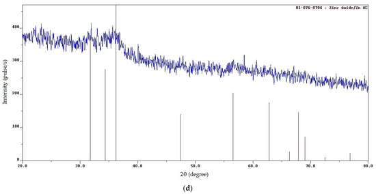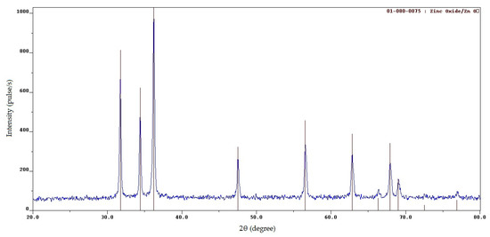 The contamination of the target zinc oxide with high carbon content in combustion products can be eliminated by calcinating (annealing) these products in an oxidizing air atmosphere [20,25,27,30]. The SCS products for φ = 1, 2, and 3 were calcined for 2 h at a temperature of 650 °C, often used in studies of ZnO nanopowders. Upon calcination in air at 650 °C, all samples of the SCS products became white, which indicated the burning away of the free and bound carbon from the zinc oxide. The XRD patterns of the calcined products for φ = 1, 2, and 3 turned out to be almost identical and are shown in Figure 6 for φ = 3.