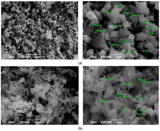 SEM images of the SCS product at various φ after calcination: (a) φ = 2; (b) φ = 3.