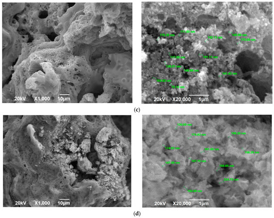 When φ increases from 0.5 up to φ = 3, XRD patterns show the presence of only ZnO; free carbon is no longer detected (Figure 2b–d) due to the formation of free carbon in amorphous form and bound carbon in unburned carbonaceous fragments of organic fuel residue after pyrolysis [20,27]. (Since the XRD patterns in Figure 2b–d show the presence of only the ZnO phase, the ● sign is not added to the characteristic peaks of ZnO.) An increasingly smooth transition from the level of the main background to the level of peaks, which are becoming wider and weaker, indicates the appearance and the increasing share of an amorphous component in the synthesis product. This is confirmed by the structure of the synthesized product in the form of a solidified foam with great many pores of various diameters and agglomerates of small nanoscale and submicron particles that are difficult to distinguish (Figure 3b–d). The amorphous component increased due to the solidification of a gel-like residue with intense gas evolution. An increase in the width of the lower part of the peaks indicates the presence of smaller crystallites with an average size of 13 nm at φ = 1 and 6 nm at φ = 2 in compliance with the Scherrer formula. According to XRD data (Figure 2), a single-phase ZnO with a wurtzite crystal structure of P63mc space group is formed by the SCS reactions at all values of the φ parameter.