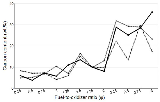 The results of the EDS determination of the local carbon content in the SCS product for different values of the molar ratio of fuel to oxidizer (φ) are shown in Figure 5, where the three lines correspond to the local carbon content at three different spots of the combustion product at the same φ.