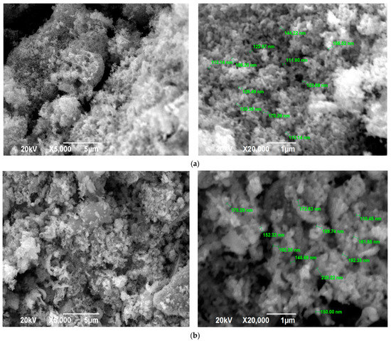 The SEM images in Figure 7 for φ = 2 and φ = 3 practically do not differ, which confirms the earlier conclusion about the formation of almost the same product for φ = 1, 2, and 3 after calcination for 2 h at a temperature of 650 °C based on the identity of the product diffractograms for φ = 1, 2, and 3. Figure 7 shows a transition from the structure before calcination (Figure 3) in the form of a solidified amorphous foam with a great many pores of various diameters and agglomerates of small nanoscale and submicron particles that are difficult to distinguish to a more homogeneous structure of a powder-porous body of agglomerates of clearly defined crystalline nanoscale and submicron particles of various shapes: lamellar, equiaxed, rounded.