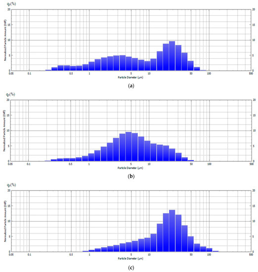 Particle-size distribution of the powder SCS product at various φ after calcination: (a) φ = 0.25, D50 = 9.0 μm; (b) φ = 1, D50 = 5.1 μm; (c) φ = 2, D50 = 19.8 μm.