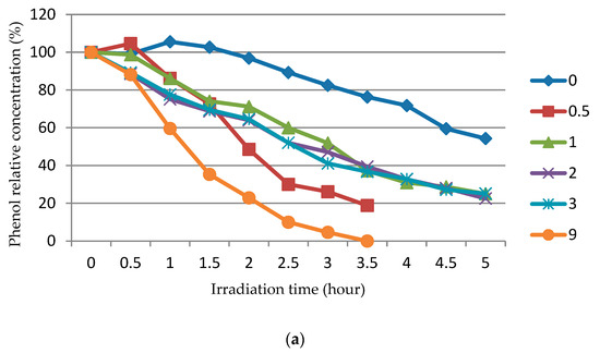 In principle, a decrease in the concentration of phenol under the action of ultraviolet irradiation can also occur due to photolysis, that is, a chemical reaction of the decomposition of molecules of a chemical compound under the action of photons. In this regard, the photolysis activity was measured in an experiment. To do this, the phenol solution was subjected to ultraviolet irradiation in the absence of ZnO powder. The results of the experiment are presented in Table 2. As can be seen from Table 2, during the first 4 h of irradiation, the concentration of phenol practically does not decrease, and only at 24 h does it decrease by 14.6%. Thus, photolysis can be ignored when discussing the results of experiments obtained during 5 h of irradiation and presented in Figure 9.