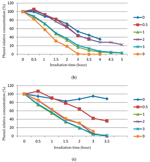 The dependence of the relative concentration (%) of phenol (C/C0) in an aqueous solution on the ultraviolet irradiation at different φ after different durations of ZnO calcination (numbers at the line designate hours): (a) φ = 0.25; (b) φ = 1; (c) φ = 2.