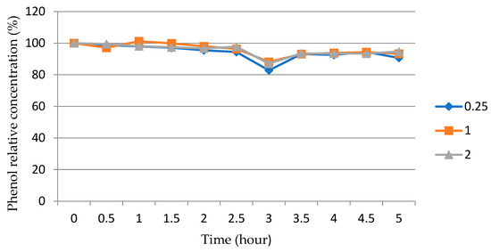 The possible influence of another factor on the change in the concentration of phenol in the solution was also considered. The adsorption of phenol molecules on the surface of reactor walls and on the surface of ZnO particles is an important phenomenon that is produced at the same time as photodegradation. In order to separate the adsorption effect from the photocatalytic impact, special experiments were conducted in which the phenol solution was in contact with the solid particles under the dark regime for several hours. The results of these experiments are presented in Figure 10.