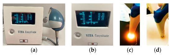The Vita Easyshade device used to measure the L*, a*, and b* color coordinates for each sample in the non-aged and aged groups (a,b). Samples tested with black and white backgrounds (c,d).