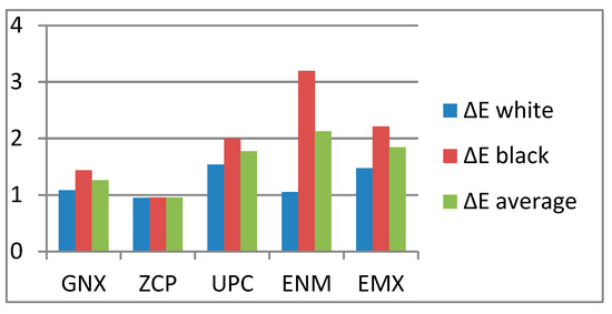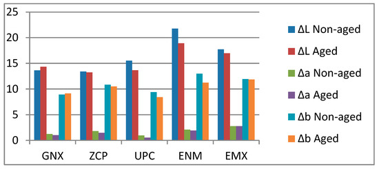 ΔL showed a statistically significant higher value for non-aged compared to aged UPC and ENM groups (p < 0.05), and showed a statistically insignificant higher value for non-aged compared to aged ZCP and EMX groups (p > 0.05), but showed a statistically insignificant lower value for non-aged compared to aged GNX group (p > 0.05). Δa showed a statistically significant higher value for non-aged compared to aged GNX and ZCP groups (p < 0.05), and showed a statistically insignificant higher value for non-aged compared to aged UPC and ENM groups (p > 0.05), but showed a statistically insignificant lower value for non-aged compared to aged EMX group (p > 0.05). Δb showed a statistically significant higher value for non-aged compared to aged UPC and ENM groups (p < 0.05), and showed a statistically insignificant higher value for non-aged compared to aged ZCP and EMX groups (p > 0.05), but showed a statistically insignificant lower value for non-aged compared to aged GNX group (p > 0.05).