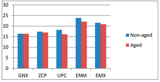 A comparison between non-aged and aged TP mean values within each group is shown in Table 9 and represented as a bar graph in Figure 5. The only statistically significant comparison was for ENM and UPC groups.